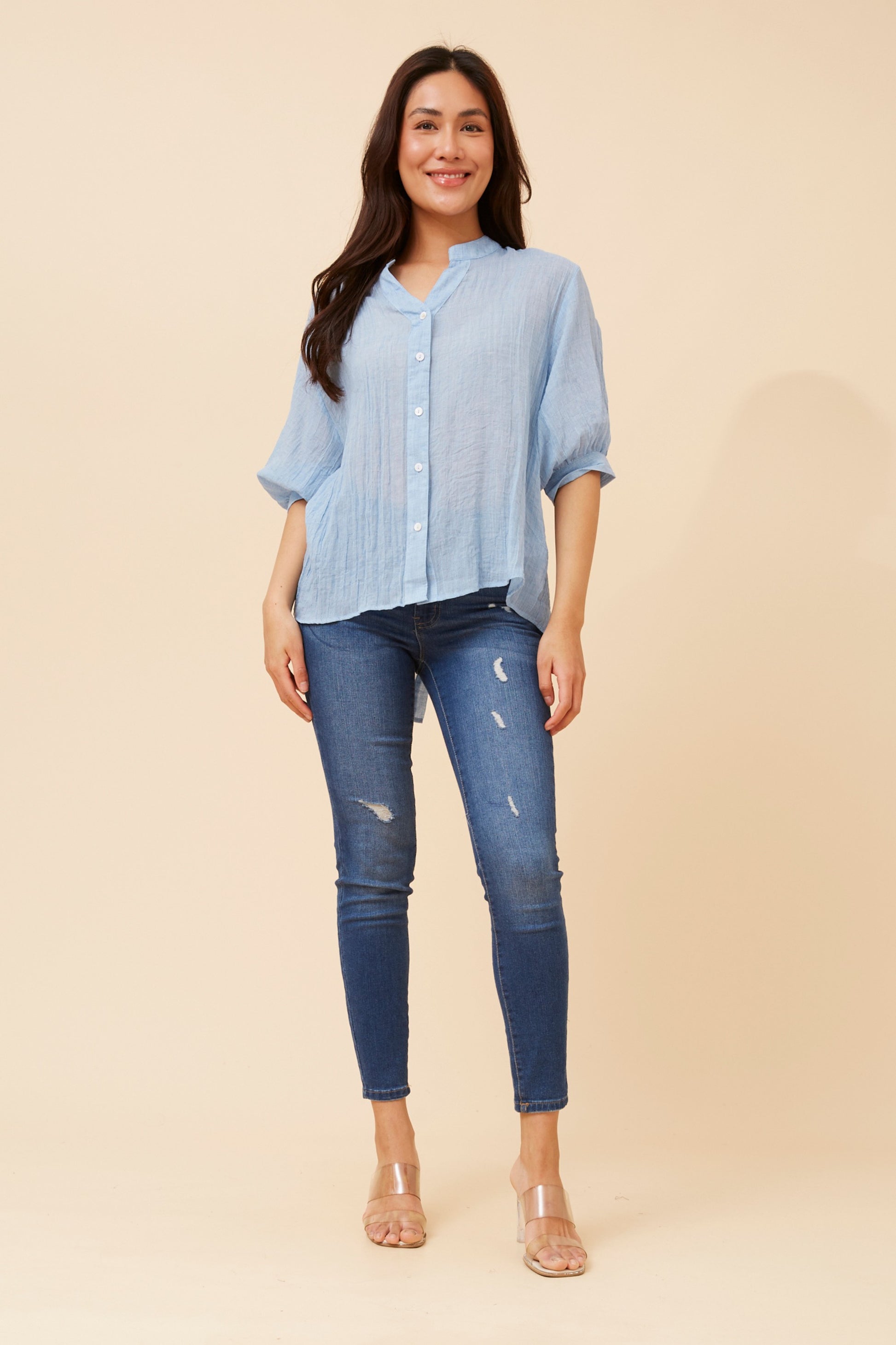 Stay effortlessly chic in this lightweight sky-blue shirt, perfect for casual days or weekend outings.