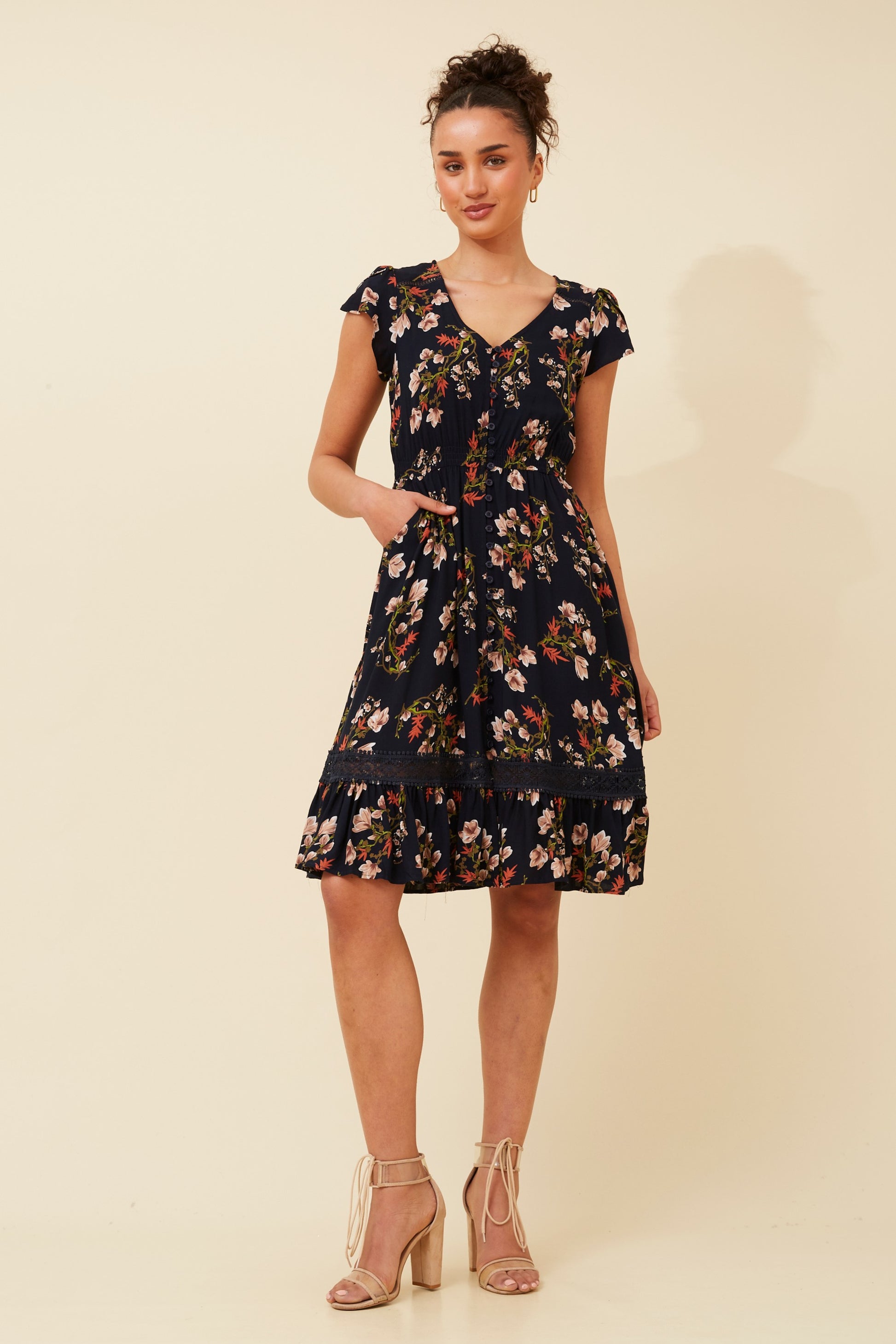 MOROCCO FLORAL KNEE LENGTH DRESS NAVY