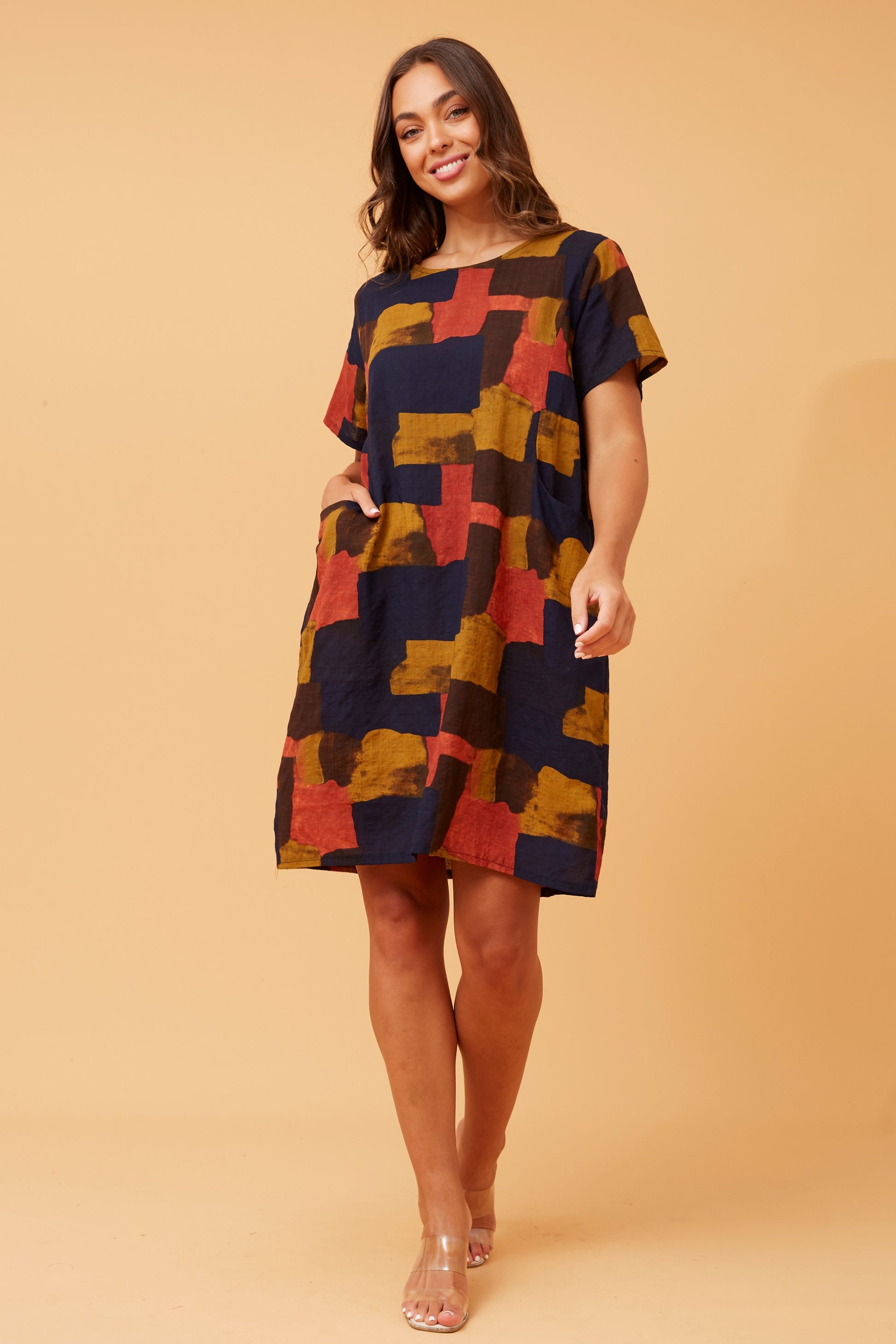 Add a pop of color to your wardrobe with this navy abstract print dress, offering a relaxed fit and easy everyday comfort.